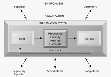 Sistem informasi diartikan sebagai suatu kumpulan yang terorganisasi dari orang, perangkat keras, perangkat lunak, jaringan komunikasi, sumber data, dan kebijakan, yang mana bertugas menyimpan, menerima, mentransformasi, dan menyebarluaskan informasi dalam sebuah organisasi (Marakas, 2012). Sistem informasi juga diartikan sebagai sekumpulan komponen-komponen yang saling terhubung yang mengumpulkan/menerima, memproses, menyimpan, dan mendistribusikan informasi untuk mendukung pembuatan keputusan dan kontrol dalam suatu organisasi (Laudon, 2014). Dalam hubungannya dengan menciptakan informasi untuk mendukung pembuatan keputusan, terdapat tiga aktivitas utama yaitu input, proses, dan output. Pada sistem informasi, input merupakan aktivitas menangkap data mentah yang muncul dari organisasi atau lingkungan eksternal di mana data tersebut akan disimpan ke sistem dan diproses menjadi informasi. Proses merupakan aktivitas mengubah data mentah ke dalam bentuk yang lebih berarti. Output pada sistem informasi mentransfer informasi yang dihasilkan ke orang yang akan menggunakan informasi tersebut (Laudon, 2014). Gambar 1 menggambarkan kerangka aktivitas pada sistem informasi.