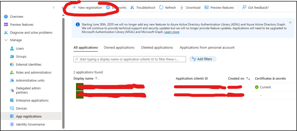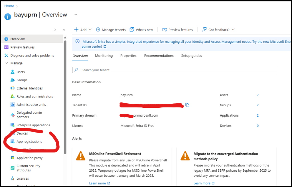 - Jika sudah masuk ke halaman setting Microsoft Entra ID, selanjutnya pilih menu App Registrations yang ada di sebelah kiri