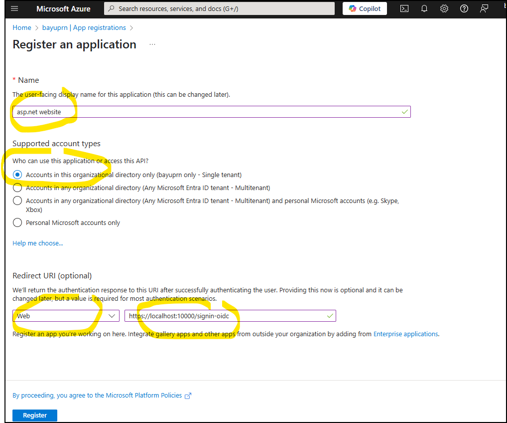 - Pada halama register, masukkan nama aplikasi yang akan dibuat. Misalkan nama aplikasinya “asp.net website“