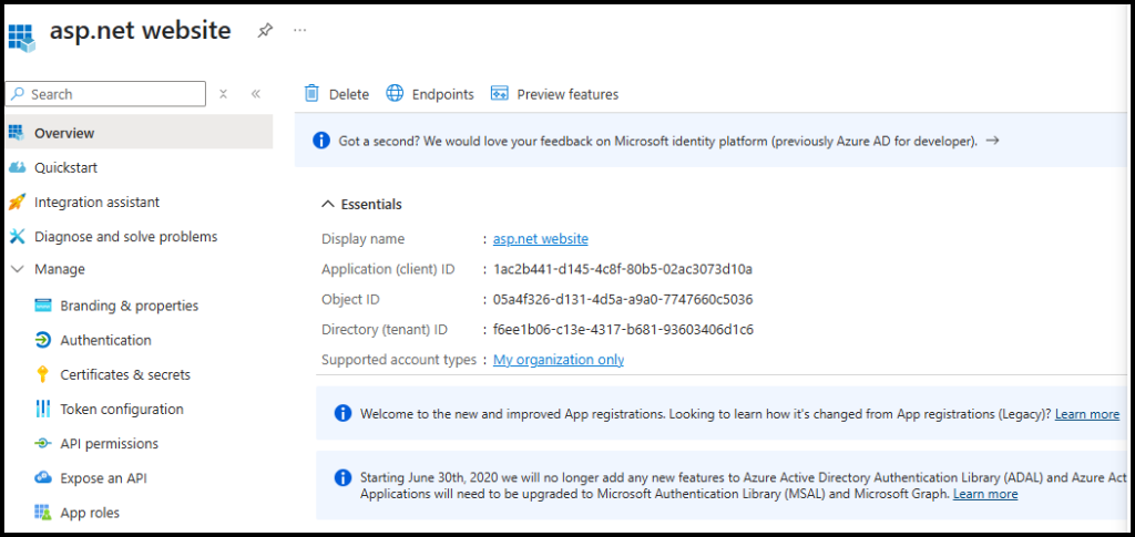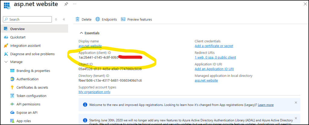 - Jika semua field sudah diisi, klik tombol Register. Setelah sukses tersimpan, maka akan dialihkan ke halaman aplikasi tersebut. Siapkan notepad untuk mencatat Client ID dari aplikasi. Lihat halaman dan cek pada bagian dengan tulisan “Application (client) ID”