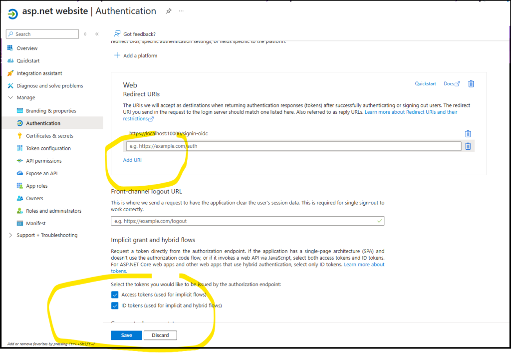 - Pada bagian Select the tokens you would like to be issued by the authorization endpoint: centang semua baik Access Token dan ID Token