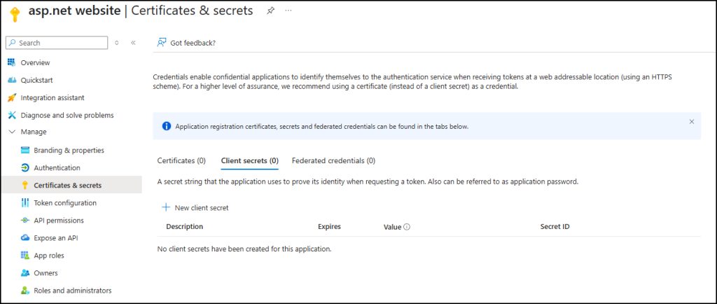 - Pada menu sidebar sebelah kiri, klik menu Certificates & Secrets. Halaman ini untuk membuat client secret dari aplikasi