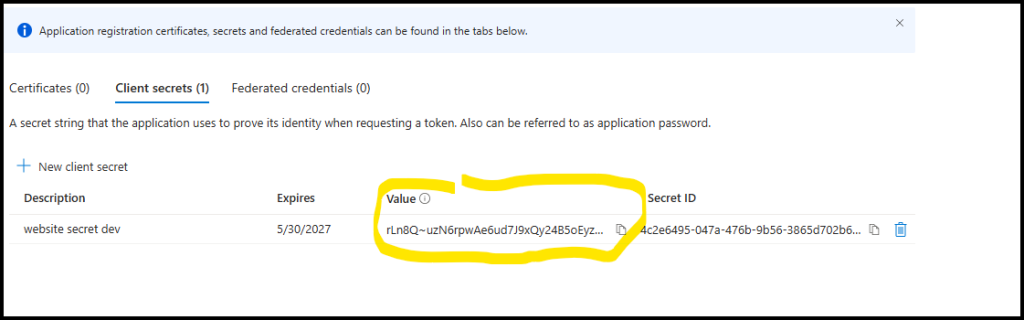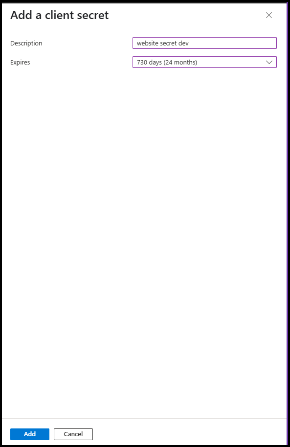 - Pada dialog Add Client Secret, masukan nama token dan lama waktu expirednya. Kita set namanya misalkan “website secret dev” dan expired 24 bulan.