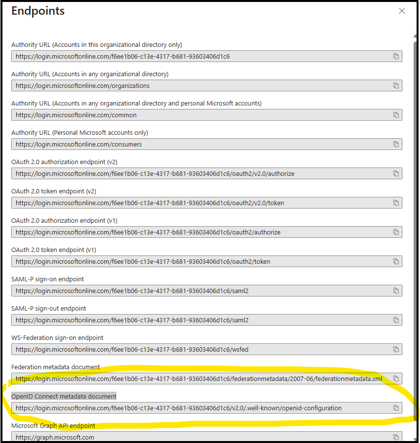 - Klik tombol Enpoints untuk menampilka seluruh enpoint terkait token OpenID/OAuth. Namun yang kita cari adalah url untuk metadata document. Cari field dengan nama Open ID Connect Metadata document, dan salin URL nya ke notepad