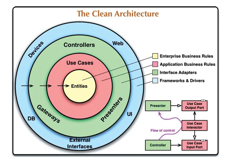 - Entities : lapisan terdalam dan paling independen dari aplikasi yang berupa bisnis rule / logika bisnis inti dan domain. Entities bisa berupa bisnis object, yang mengenkapsulasi bisnis rule secara umum dan general. Perubahan operasional seperti perubahan paging di aplikasi atau security seharusnya tidak berdampak pada entities.