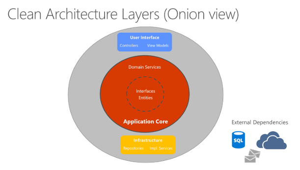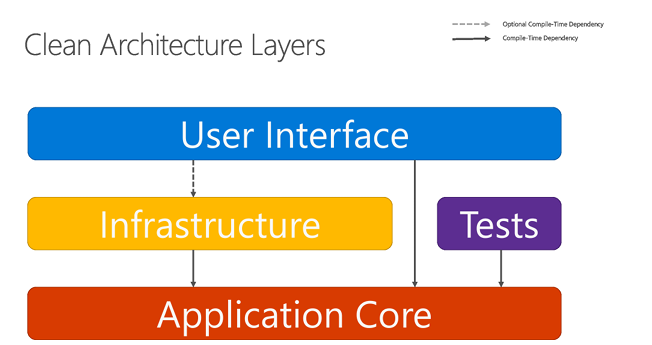 - Framework & Drivers : merupakan lapisan terluar yang berisi detil teknis dan implementasi yang sangat bergantung pada semua lapisan di dalamnya. Web framework seperti asp.net core view, react js, bootstrap, atau webform asp.net pada web adalah contoh detil implementasi.